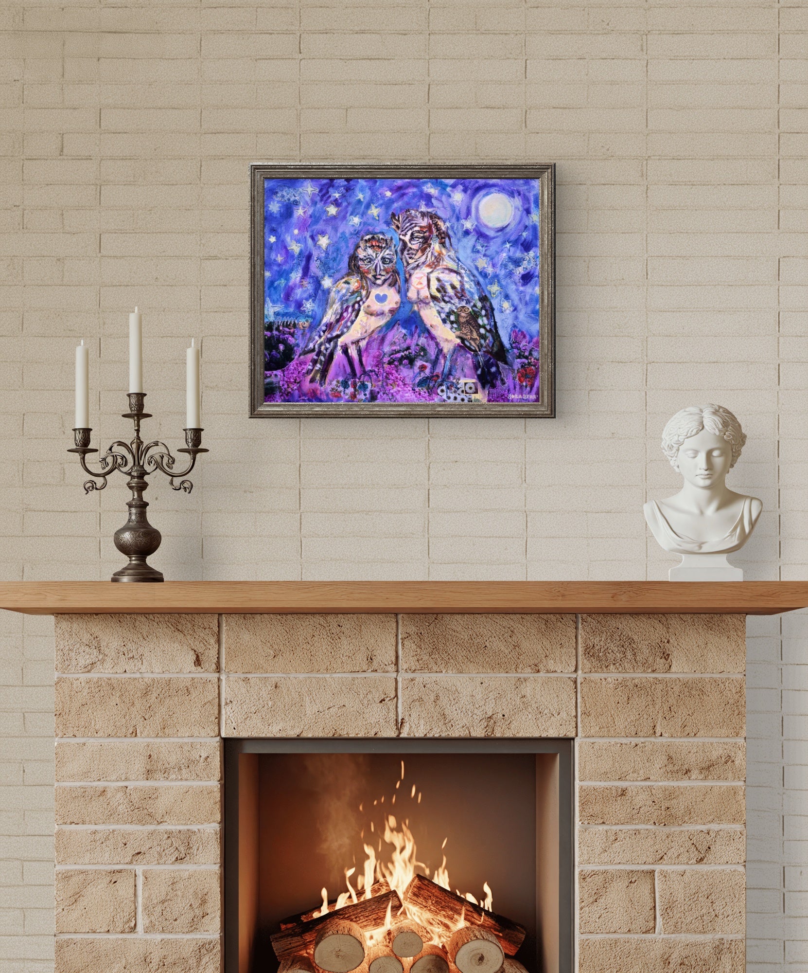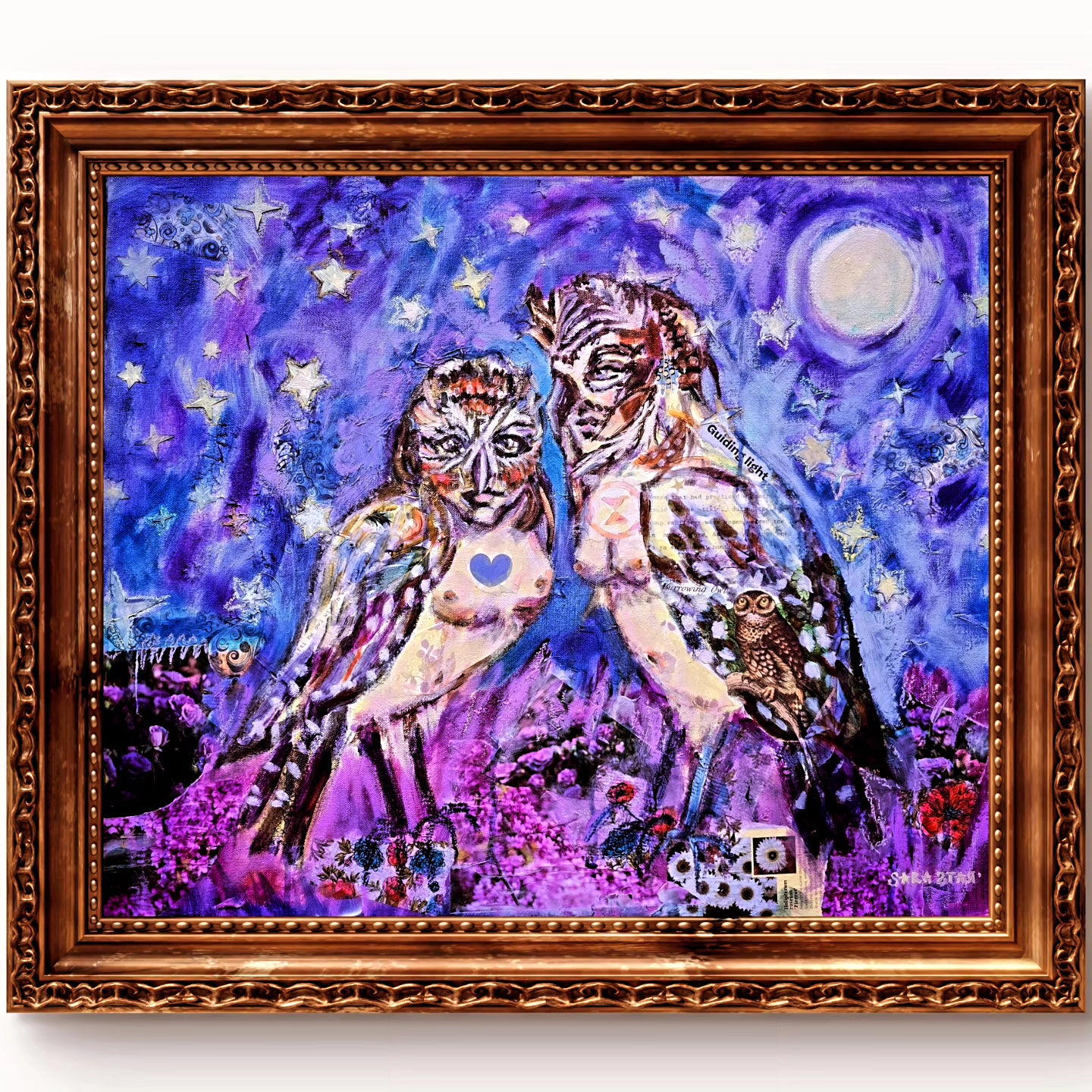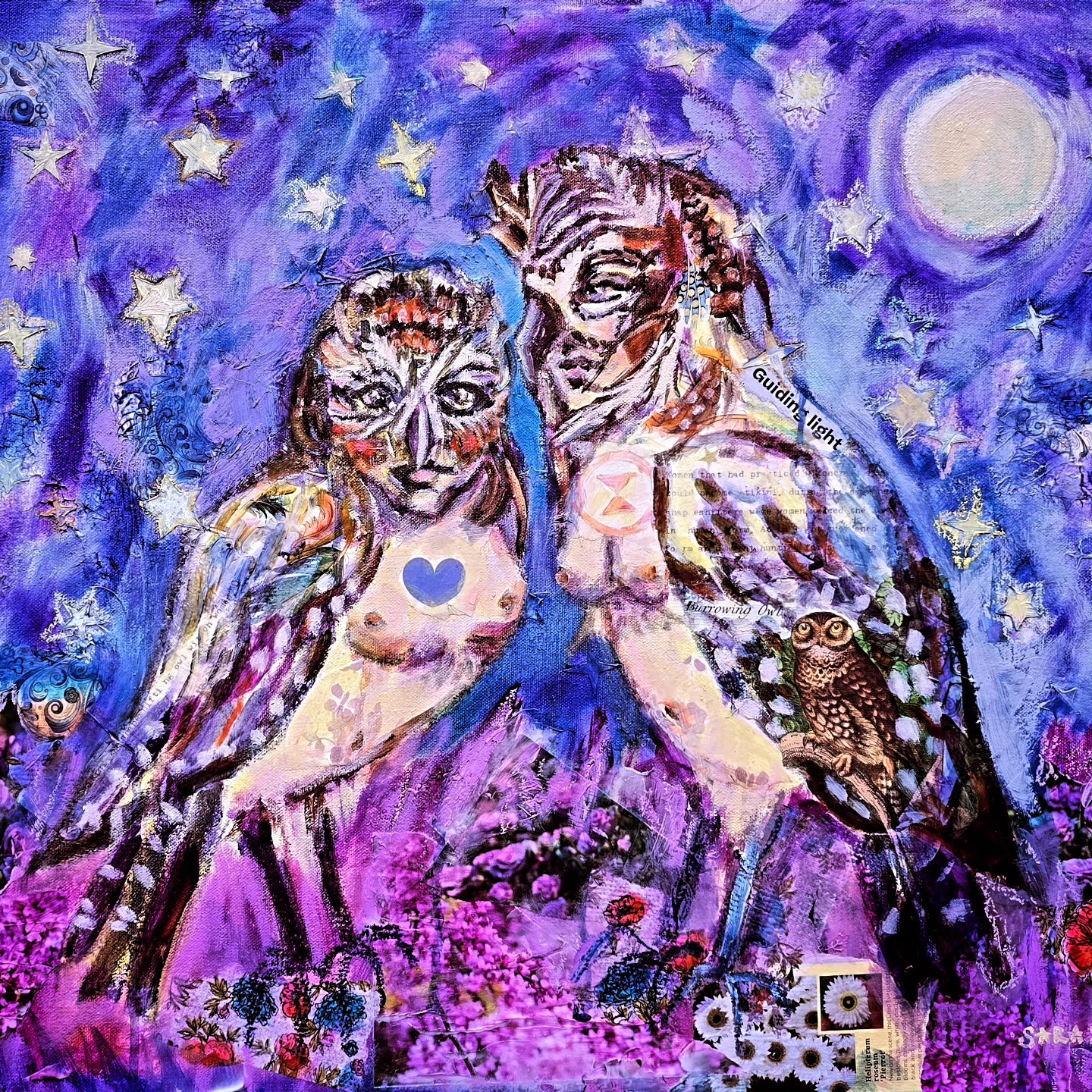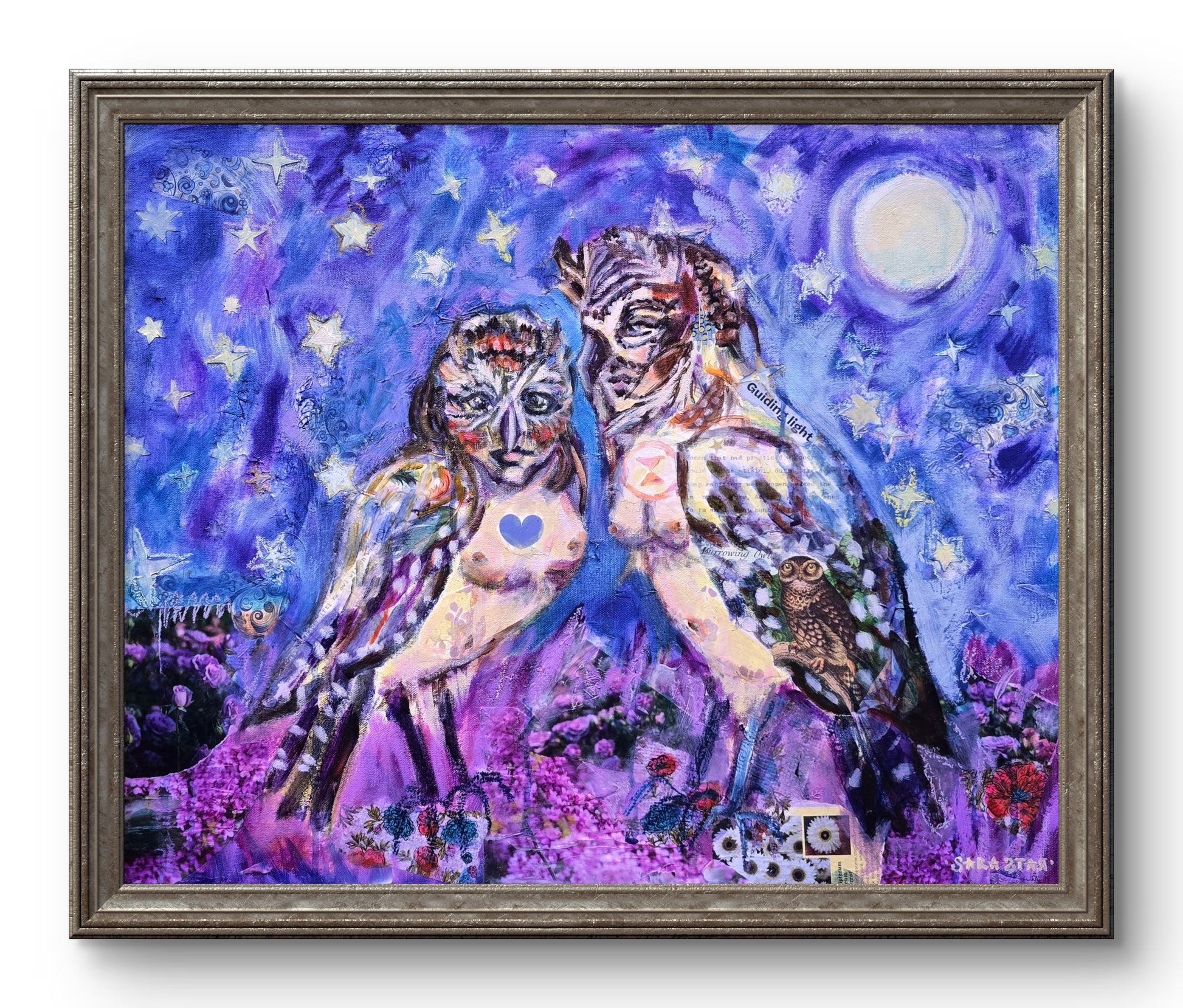 This 20x30 inch canvas has the option to come custom framed. I created this picture with layers of mixed media, collage and oil paints for a luminous and dramatic scene that delivers new treasures upon every new examination. This painting inspires the viewer to seek knowledge and wisdom in friendship and mystery. What powerful change are these two planning? You are invited in on the secret with this artwork.