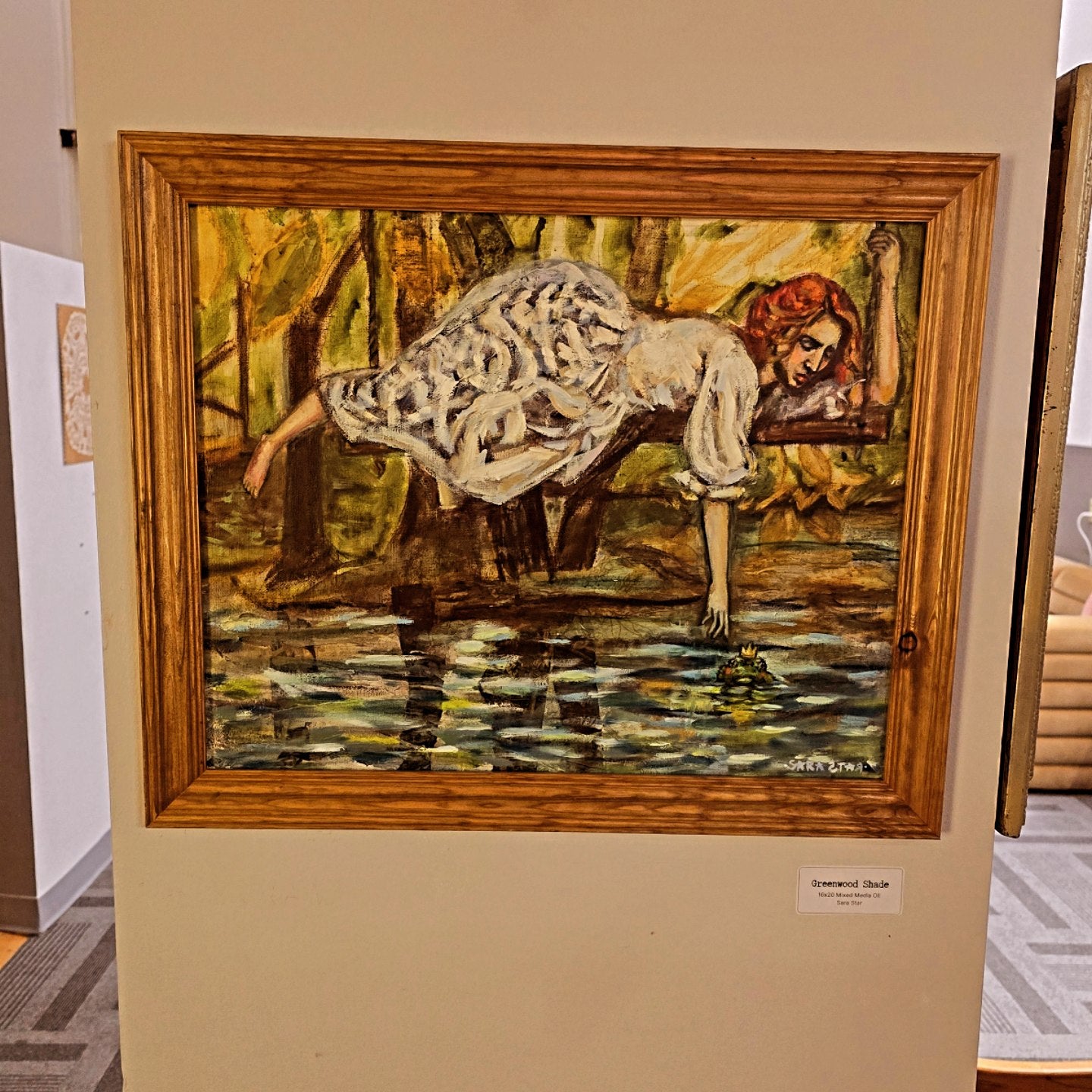 The princess lounges on her tree swing over the peaceful waters bathed in dappled light. Languidly she reaches out to touch the frog prince in the deep clear pool. I love in this story how ardently and sweetly the frog pursues his princess, writing her a beautiful song and coming to her door. The transformation from frog to prince can be an inspiration not unlike the process of painting or pursuing any dream as there are stages of growth and change in identity as we become our ideal selves. This painting serves as a reminder that you are on your path. 16 x 20 mixed media oil painting on canvas board in a vintage frame.